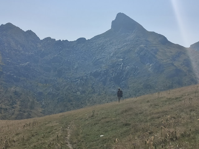 El sendero discurre por un amplio y florido prado, superando laderas moderadamente empinadas que Maite, ayudada de los bastones (¿serán eléctricos?), las ataca con ritmo vivaz. Tras de ella, voy echando la vista a las cumbres que ya asoman por encima de las amplias laderas: de frente, a la izquierda, asoman algunas cotas de la Paquiza; delante de nosotros, con el sol comenzando a lucir, se ven el Sobarcal y el Mallo de Acherito. De vez en cuando me vuelvo para admirar el pico Maz  y la Peña Euzcarre. La sierra de los Alanos, va asomando sus cumbres, poco a poco, en consonancia con nuestra altura.
